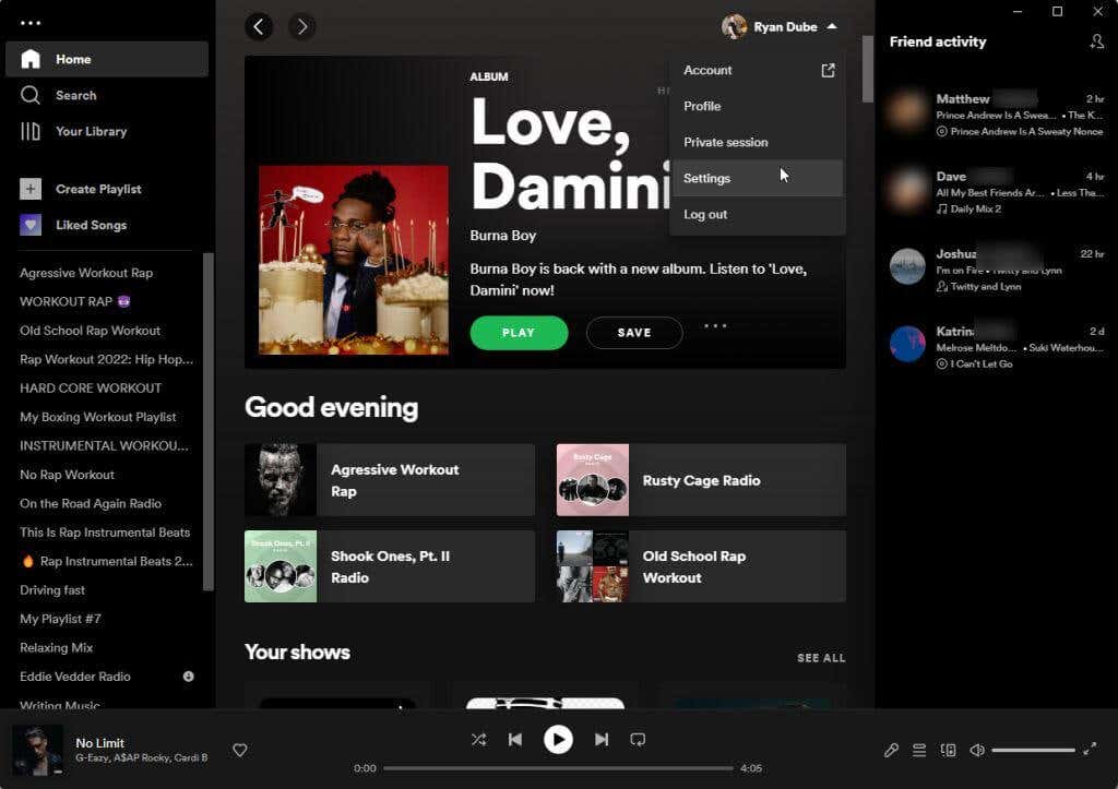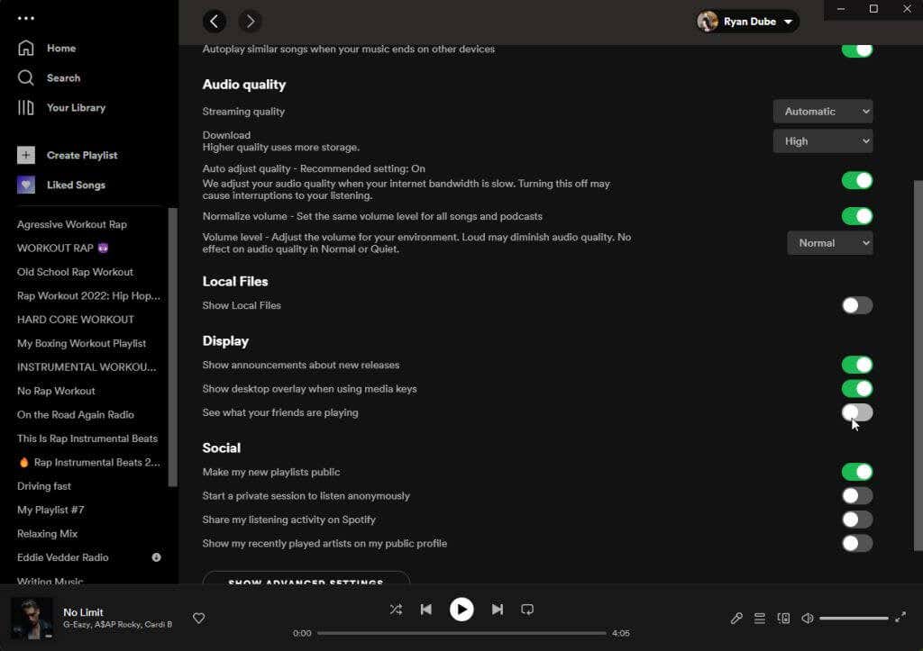 On the Spotify desktop app, select your profile image and select Settings from the dropdown menu. On the Settings page, scroll down to the Social section. Disable the toggle to the right of Share my listening activity on Spotify. This will disable the ability for your friends to see what you’re listening to on Spotify.