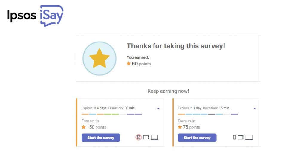 Once you start taking surveys, you’ll realize quickly that it isn’t a huge money-maker. For example, a typical payout at Ipsos ISay is 2500 points for a $25 gift card. Considering a 30-minute survey may provide 125 points, you’d have to take twenty 30-minute surveys to get that $25. That’s basically earning $2.50 an hour.