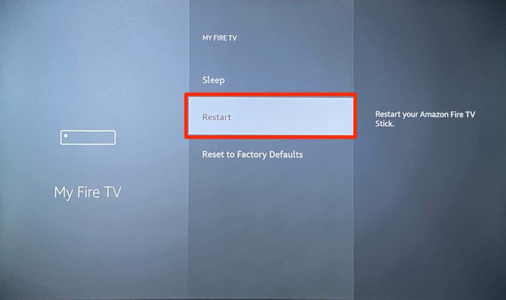 You could unplug the power adapter from the wall outlet or the USB power cord from the Fire TV stick to force a restart. Wait 3-10 seconds before plugging the streaming back into its power source.