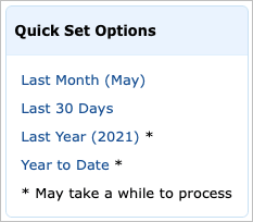 These reports give you a fast snapshot of items from Last Month, the Last 30 Days, Last Year, and Year to Date. Note those reports with asterisks may take longer to process.