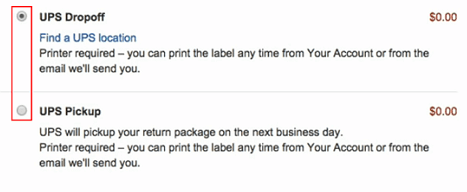 6. Find the return method section and choose the UPS Drop-off or UPS Pickup options.