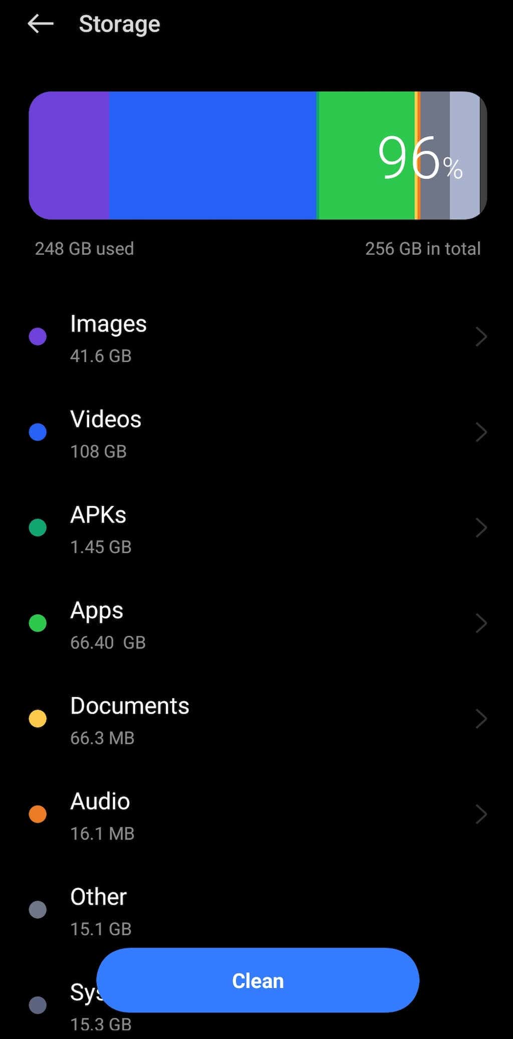 Most Android phones have a feature to optimize storage space. If you notice too much stuff being stored on your phone, head to your phone’s Settings and find the Storage section. In this section, you’ll find an option to Clean or Free Up space on your smartphone. It’ll remove old files and app data and offer to delete big files like videos that take up a lot of space.