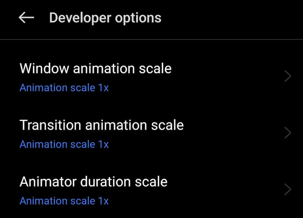 Look for the three animation settings: Window animation scale, Transition animation scale, and Animator duration scale. By default, they’re all set to 1x. You can speed them up, slow them down, or turn the animations off completely.