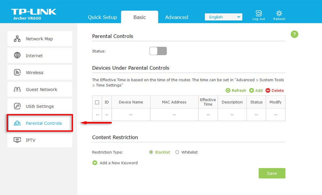 - Locate the Parental Controls settings. Most routers will have some form of content-blocking settings, that’s usually called “Parental Controls”, “URL Filtering”, “Blocking”, or similar.
