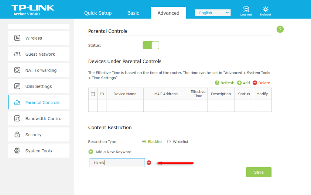 - Press Save and make sure the settings are toggled on. Your Android phone and other devices on your home network will now be completely unable to load the TikTok website or app.