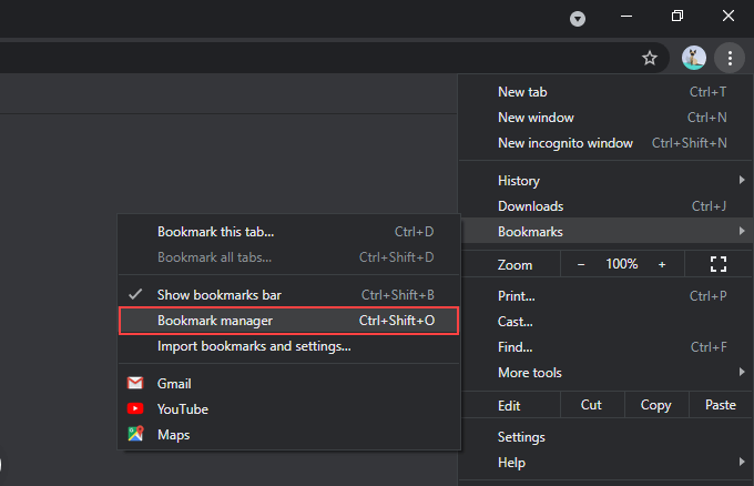 1. Open Chrome’s More menu (select icon with three dots at the top-right of the window), point to Bookmarks, and select Bookmark Manager. Or, press Ctrl + Shift + O (PC) or Cmd + Option + B (Mac) instead.