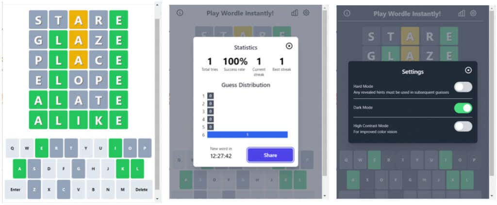 You can adjust settings for hard mode, dark mode, or high contrast mode. Plus, you can copy the game to your clipboard to brag (well, share) on social media.