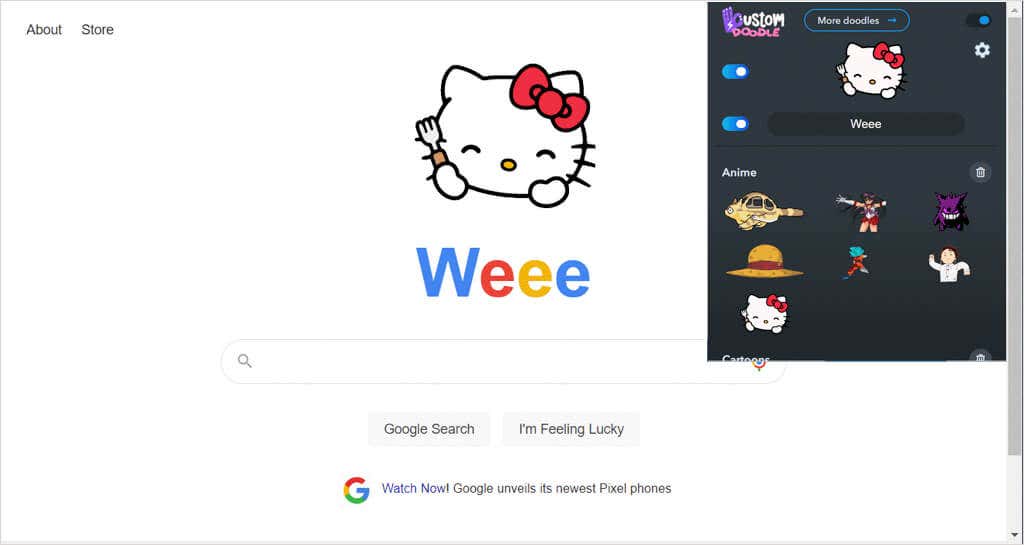 You can use an image or animation, adjust the size and text, customize the color, and change the page background color. Head to the extension’s website to add cartoons, games, movies, GIFs, or memes to your collection. Then, swap out the current Google doodle from the extension’s pop-up window. If you’re artistic yourself, upload your own doodles.