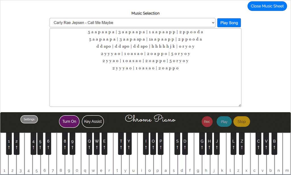 Maybe making music is your forte. With the Chrome Piano add-on you can play anything from Chopsticks to songs from popular artists using the Music Sheet.