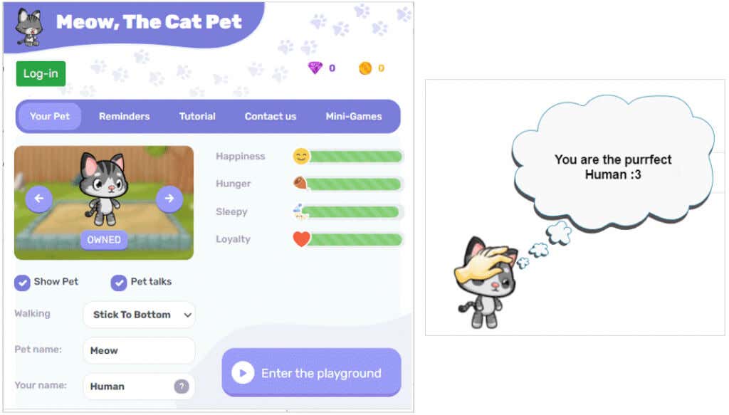 Move your cursor over the cat to pet him and right-click to feed him, have him take a nap, do a dance, or lick to clean his fur. You can keep track of how happy Meow is in the extension’s pop-up window.
