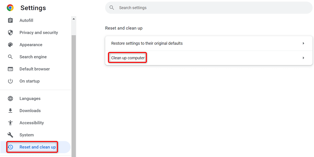Chrome’s out-of-memory error can result from a virus or malware file running on your computer. In this case, you can use your browser’s built-in malware scanner to find and remove suspicious content from your machine.