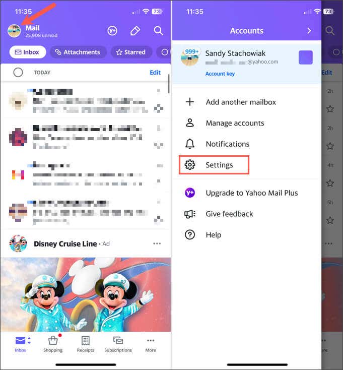 - Open the Yahoo Mail app on Android or iPhone and tap your profile icon on the top left.
