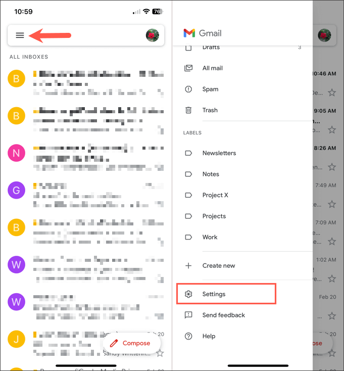- Open the Gmail app and tap the Menu icon (three lines) on the top left.