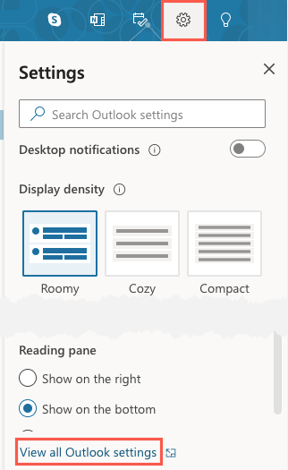 - Select the gear icon on the top right and choose View all Outlook settings in the sidebar that displays.