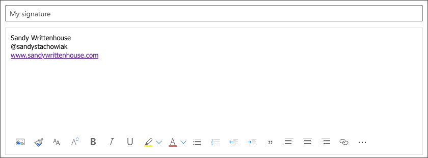 - Give your signature a name and enter the text in the box beneath. Like Gmail, you can format the signature using the toolbar in the editor. Apply bold or underline to a phone number, add an image or company logo, or insert social media links.