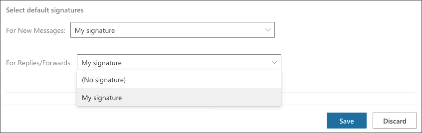 - If you’d like to set the new signature as the default for new emails and/or replies and forwards, select its name in the drop-down boxes below Select default signatures. Be sure to Save the signature first, otherwise it won’t display as an option.