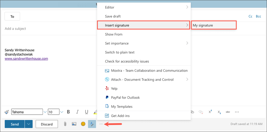 In the toolbar at the bottom of the New mail window, select the three dots on the far right. Move to Insert signature and pick the signature in the pop-out menu.