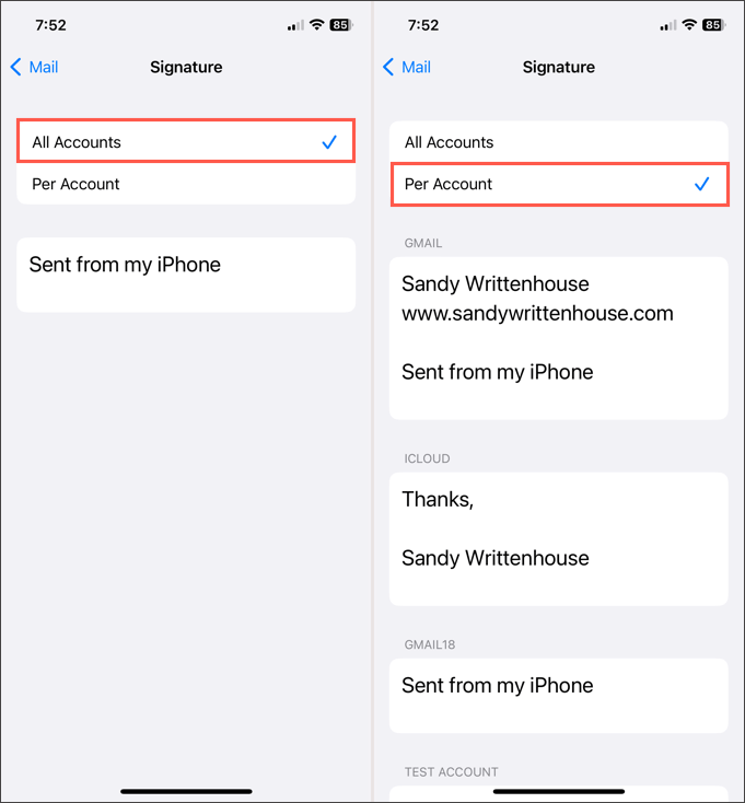 - Turn on the toggle for Per Account to use a different signature for each connected account. Then, enter the signature in each account’s box.