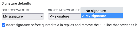 - If you’d like to set the new signature as the default for new emails and/or replies and forwards, select it in the drop-down boxes below Signature defaults.