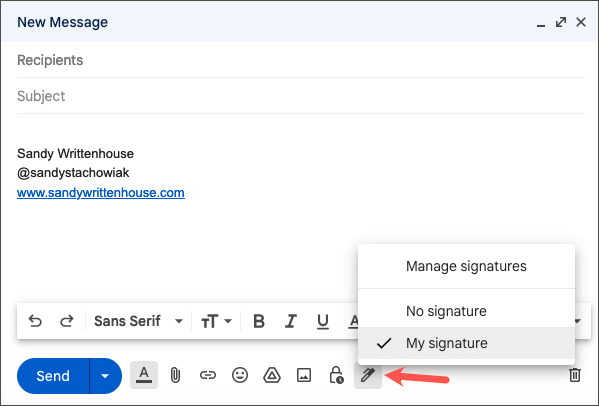 If you decide not to set a default or want to choose a different signature for your email, this is easy to do.