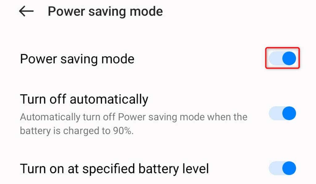 - Disable the Turn on at specified battery level option as well. This ensures your phone doesn’t automatically enable the mode.