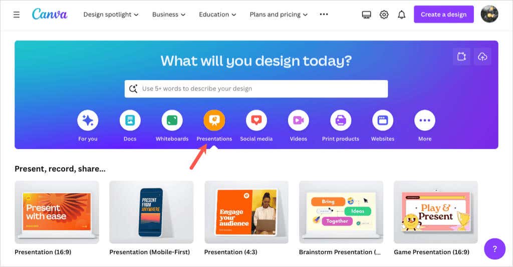 On the Canva home page, select Presentations below the Search bar. Then, choose a slideshow size or Canva presentation template to get started.