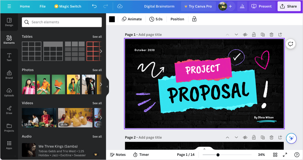 Be sure to check out the full set of Canva presentation tools in the editor. You can add animations, insert slide transitions, use the grid view to rearrange presentation slides, and more.
