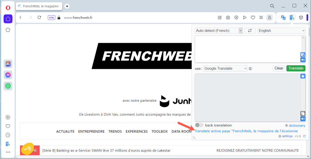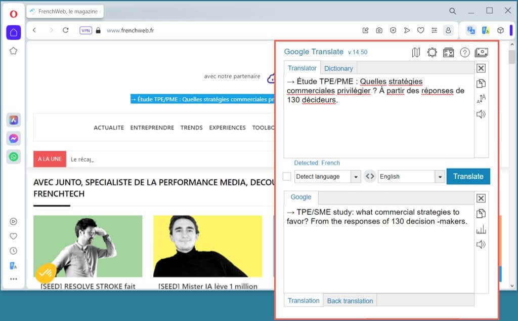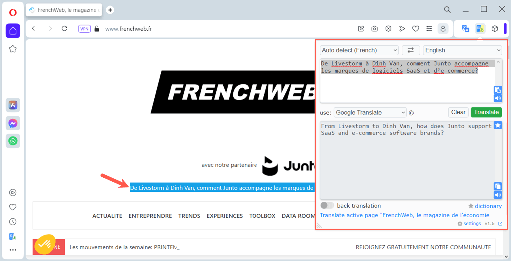 The Opera web browser doesn’t have a built-in translation tool or an official add-on. However, there are many translator extensions you can pick from with two popular options below.