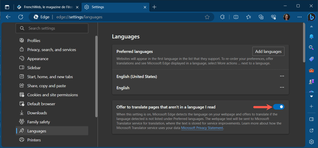 - Choose Languages on the left of the subsequent screen and turn on the toggle for Offer to translate pages that aren’t in a language I read. Note that you can add and reorder your preferred languages directly above the toggle.
