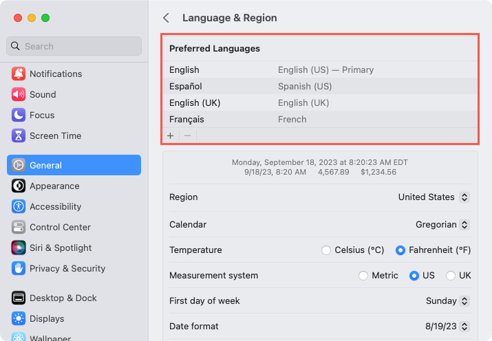 - Then, use the plus sign button at the bottom of the Preferred Languages list to add another or the minus sign button to remove one.