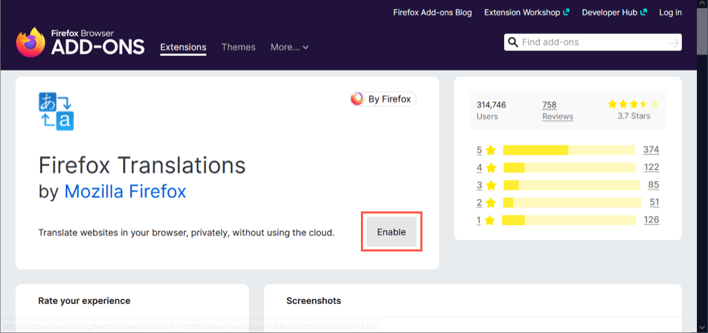 - Visit the add-ons page for Firefox Translations and select Enable.