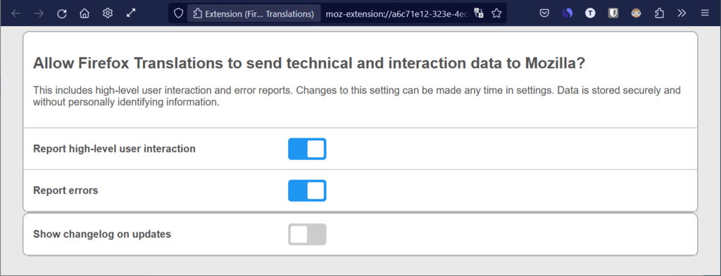 - You’ll then be directed to the extension’s options page for allowing data to be sent to Mozilla. Turn on the toggles for the options you want to use and you can then close the tab.