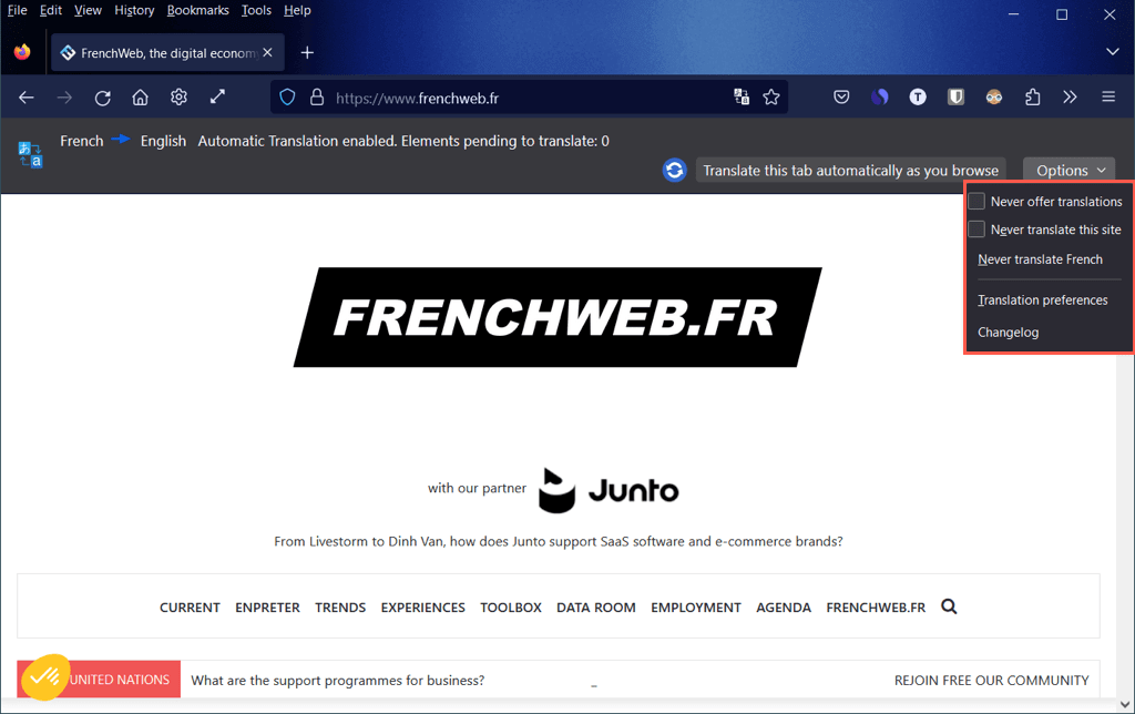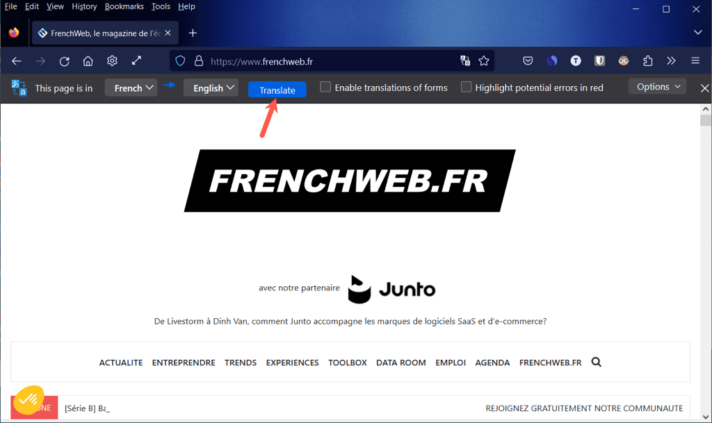 - When you visit a web page that you want to translate, you’ll see a translation toolbar appear at the top. Select Translate to translate the page. Optionally, you can adjust the languages if needed or check the boxes for additional tools.