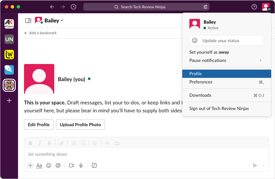 - In Slack on your desktop or the web, select your profile icon on the top right and choose Profile.