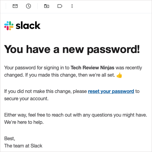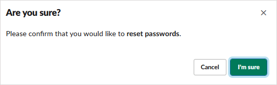 - Do NOT sign everyone out of all apps: This keeps all members signed in but sends them a Slackbot message that you want to reset their password. They will then receive an email from Slack with a password reset link.