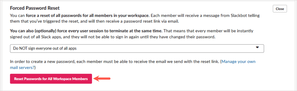 - Sign everyone out of all apps: This signs all members out of Slack at the same time. They will not be able to sign into your Slack workspace until they change their password and should receive an email with instructions.