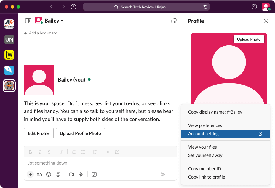 - Select your Slack workspace name on the top left to open the menu.