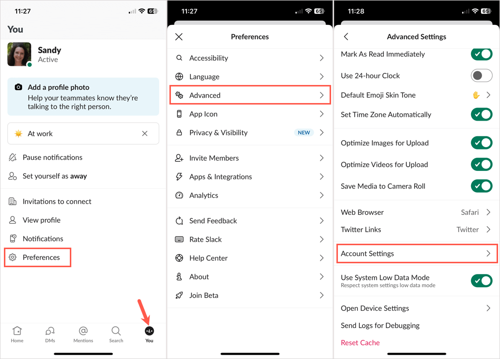 - Choose Advanced and tap Account Settings.