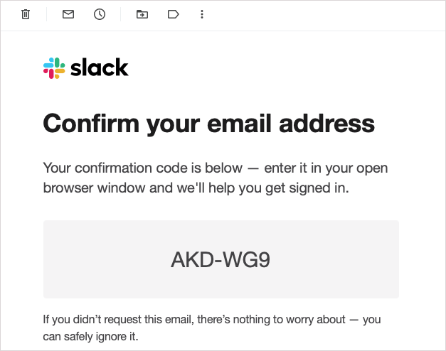 - Check your inbox for an email from Slack containing a confirmation code. If you don’t see the email, be sure to check your spam or junk folder.