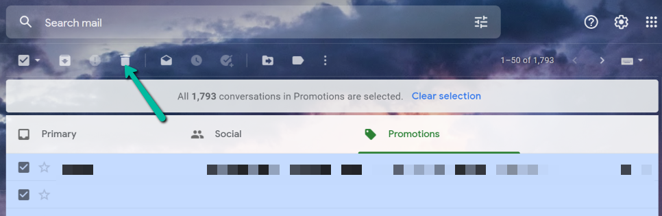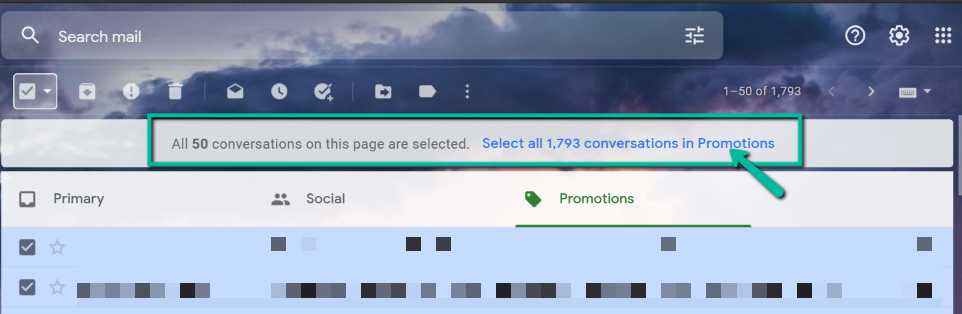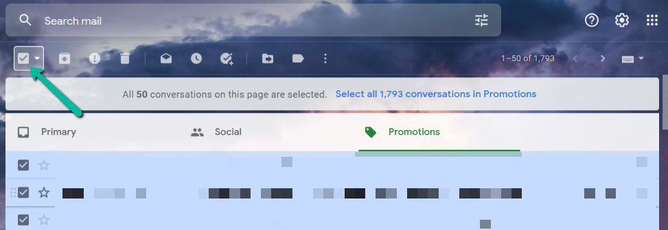 - On the top-left side of your screen, check the small tick box under the Search mail search bar. This will select every email on the page, which is up to 50 emails, and all selected emails will turn into a darker shade. If you have more than 50 promotional emails, doing this won’t get everything, but the next step will.