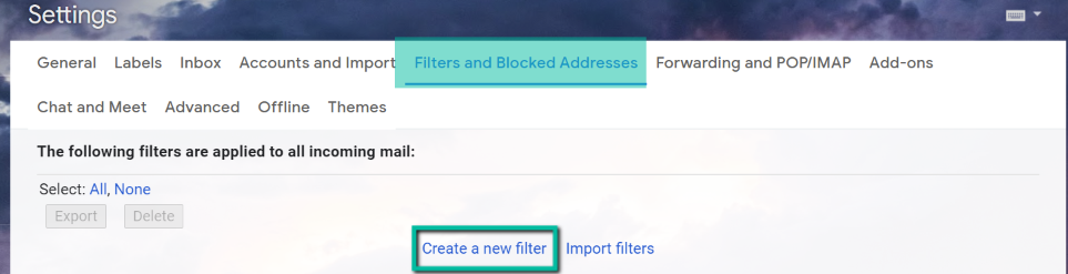 - On the Settings page, select Filters and Blocked Addresses. From this menu, select Create a new filter.