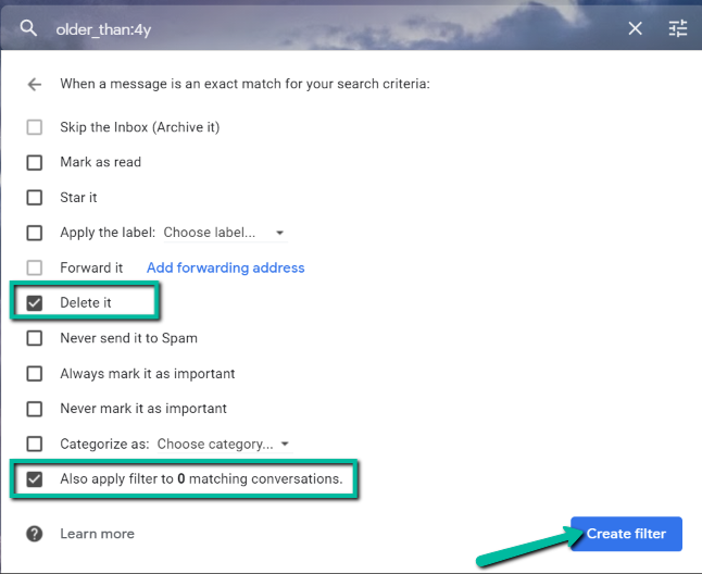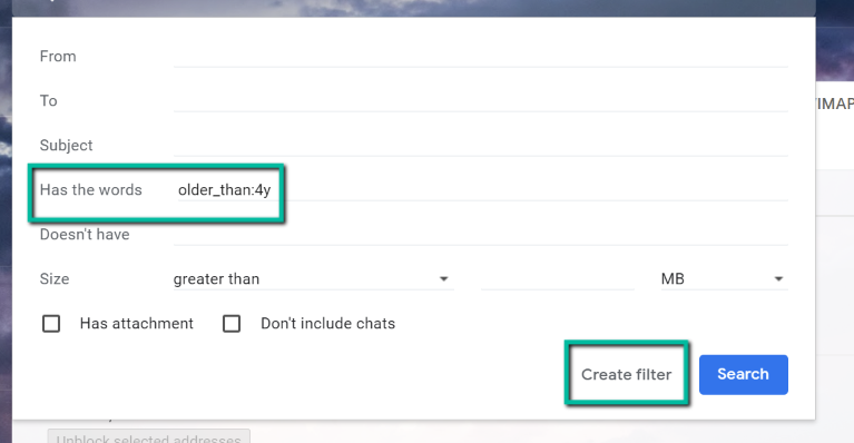 - On the pop-up box, type older_than:X on the “has the words” field. The X on this command should be the timeframe you prefer for deleting old messages. The command will d for days, w for weeks, m for months, and y for years. For example, if you want the time frame to be four years, you change the X to 4y. Then, select Create filter.
