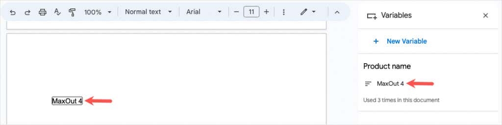 - You’ll then see the Variable with its name in your document and in the Variables sidebar that opens on the right.