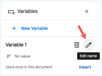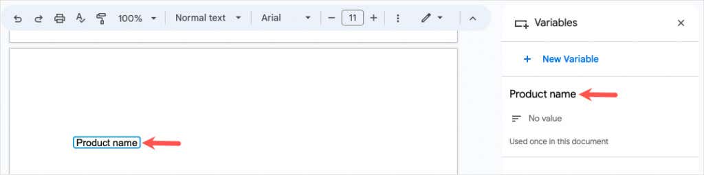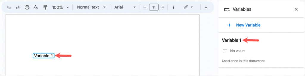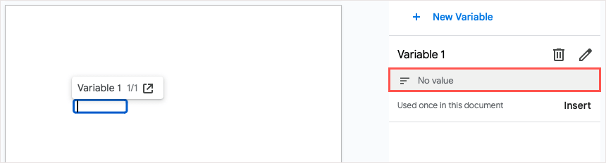 Select No value below the Variable name. You’ll see the Variable in your document empty and ready for you to enter the text. Once you do, use Enter or Return to save it.