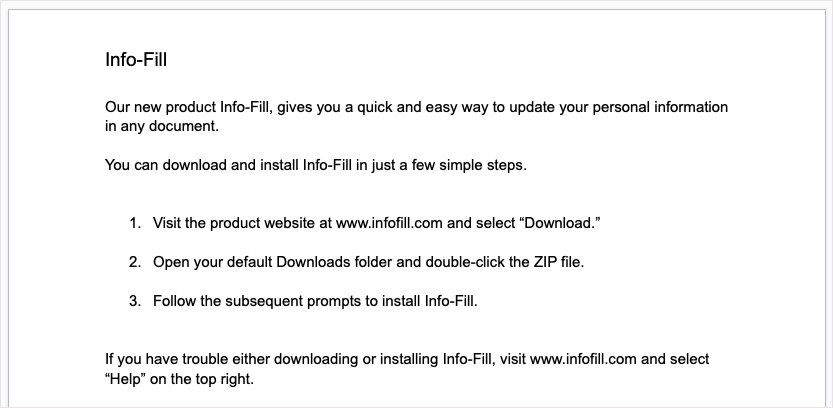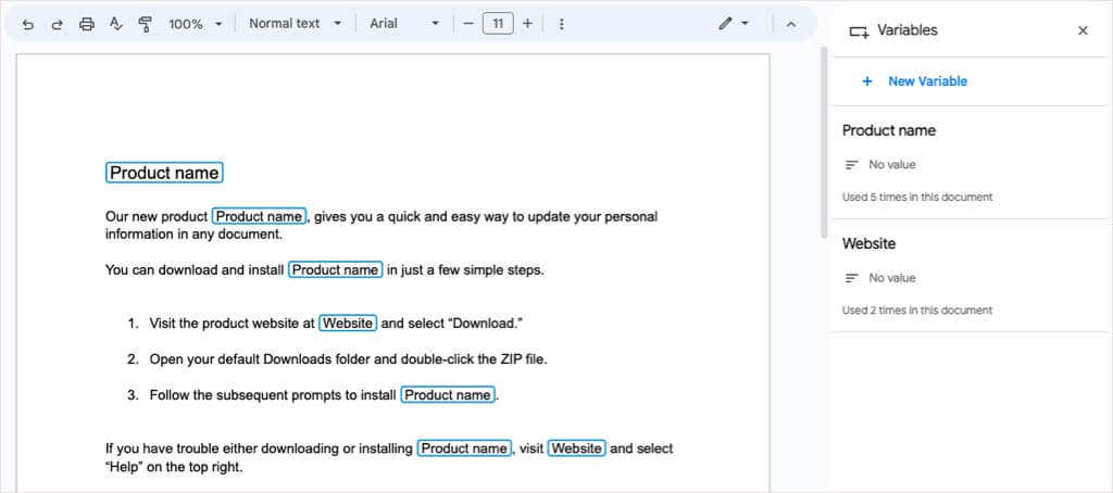 Here, we’re creating a document for our client’s new product. We don’t have the product name or the website address yet, so we insert Variables for those two items instead. With the Variables sidebar open, you can see them with blue borders throughout the text.