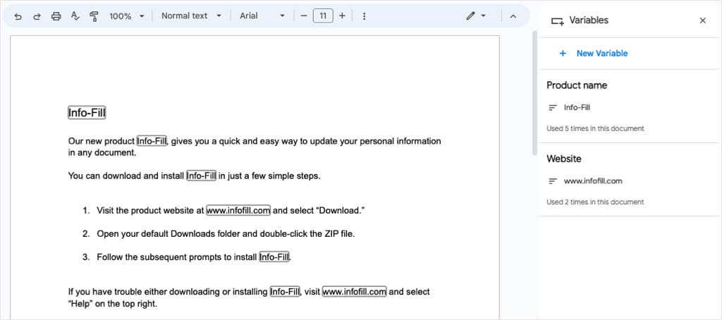 Let’s look at how to insert and use Variables in Google Docs with a couple of examples.