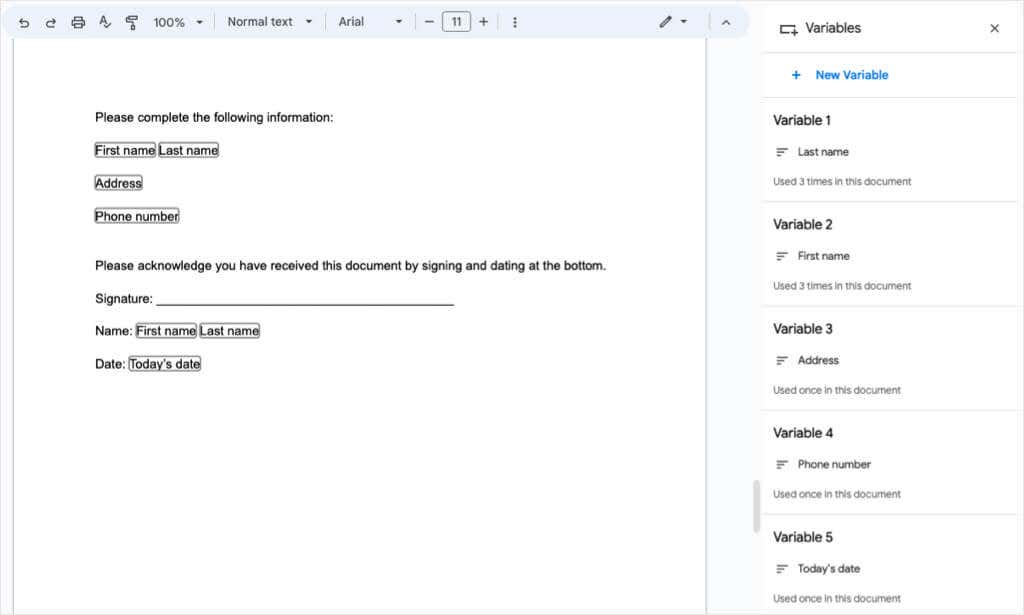 As mentioned, the Variable Smart Chip is a text placeholder that you can insert in your document. This is ideal for text you want someone else to add like first or last name, address, or phone number. You can also use Variables for things you need to add but are waiting for like a product title, date, or website address.
