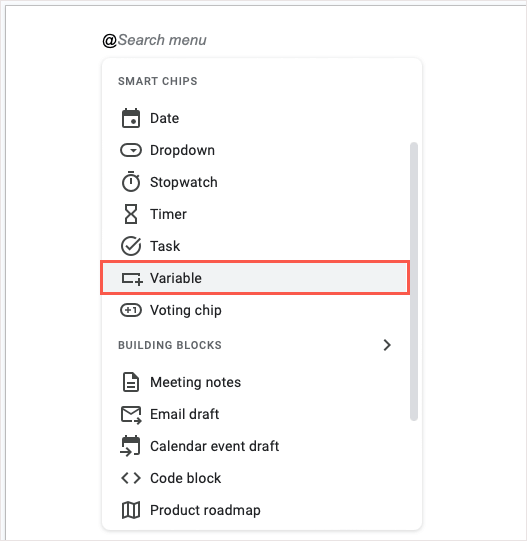 - Select Insert > Smart chips and choose Variables in the pop-out menu.