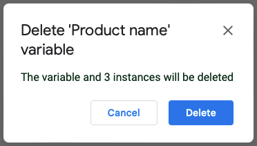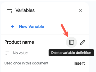 If you decide you no longer want to use a Variable, you can delete it. Keep in mind that this will remove the Variable, and its value if assigned, from every location in your document.