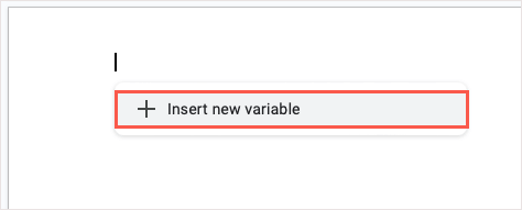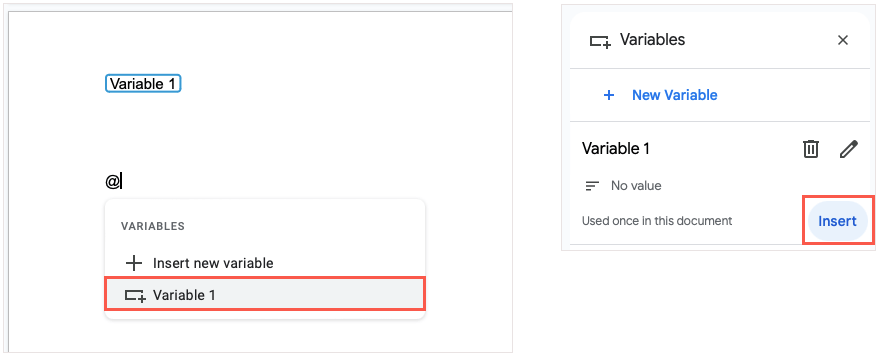 - Open the Variables sidebar, hover over the Variable you want to use, and select Insert.